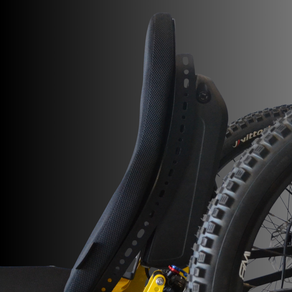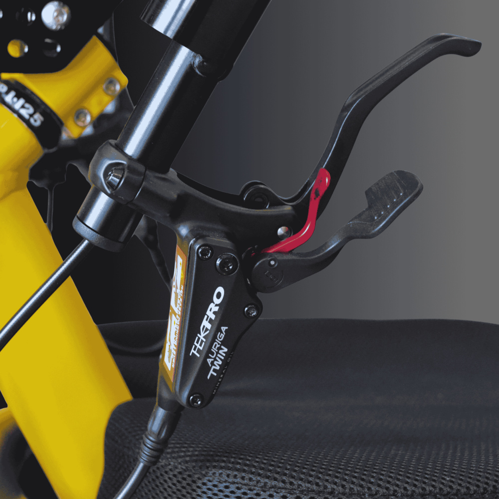 Additional to the front brake, the Tektro rear braking system lets you brake smoothly while riding and easily engage a secure parking brake when stopped. The rear brake lever is conveniently located on the left handgrip or, for tetraplegic users, mounted on the backrest to allow braking with the elbow for greater ease and comfort. Designed for safety and peace of mind.