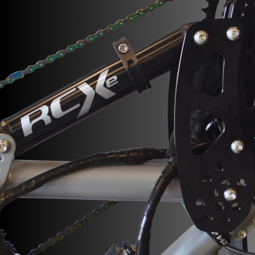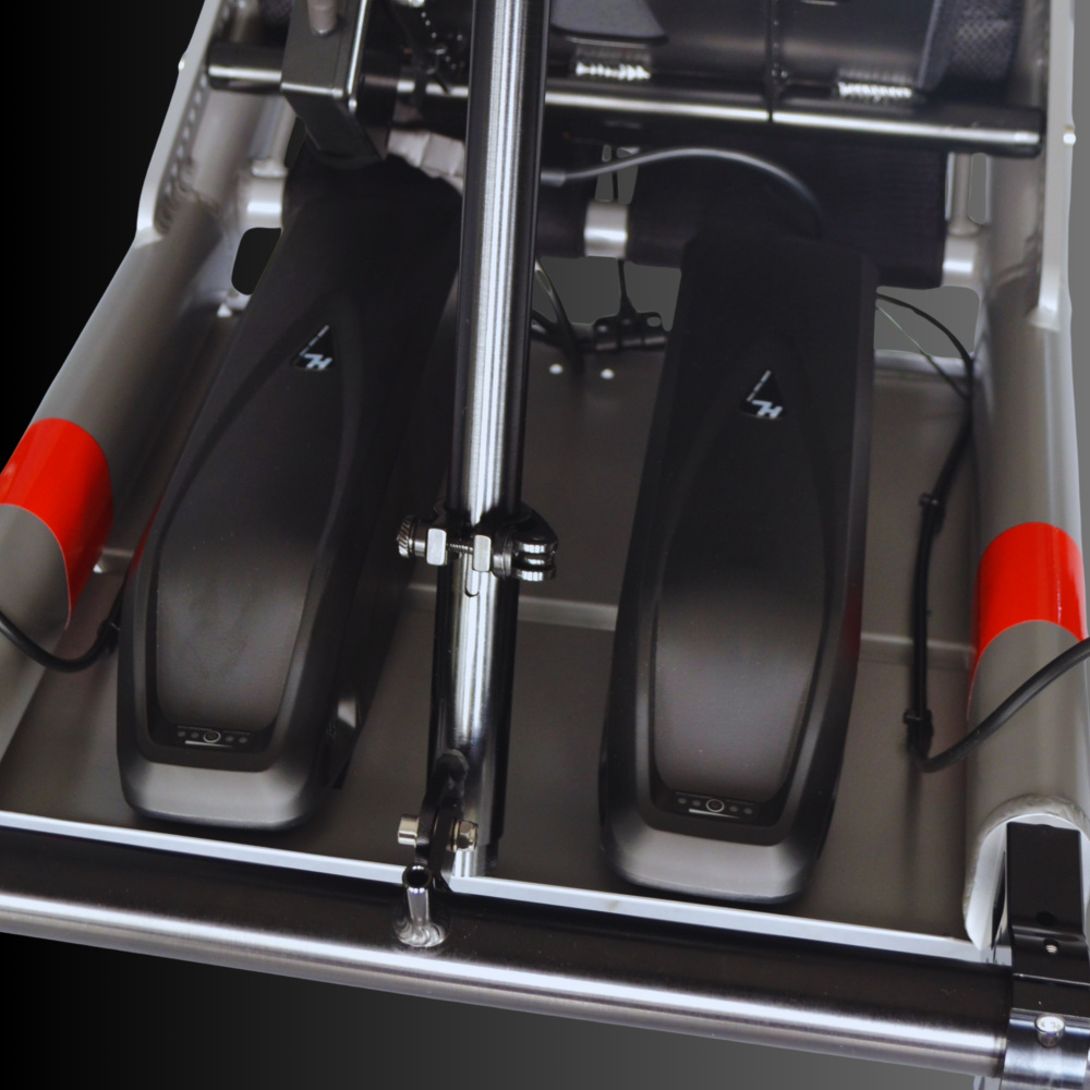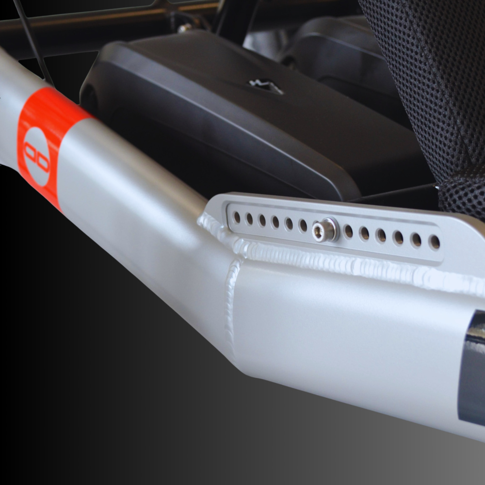 The batteries are mounted on a welded plate at the base of the handbike’s frame. This solution integrates structure and function and provides stability and strength.