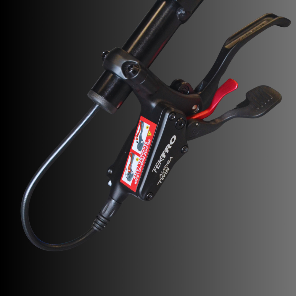 Rear Brake (mandatory): Dual Tektro Auriga Twin hydraulic disc brakes with integrated parking brake, 180mm, mounted on a support for the riht elbow